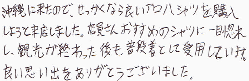 沖縄に来たので、せっかくなら良いアロハシャツを購入しようと来店しました。店員さんおすすめのシャツに一目惚れし、観光が終わった後も普段着として愛用しています。良い思い出をありがとうございました。