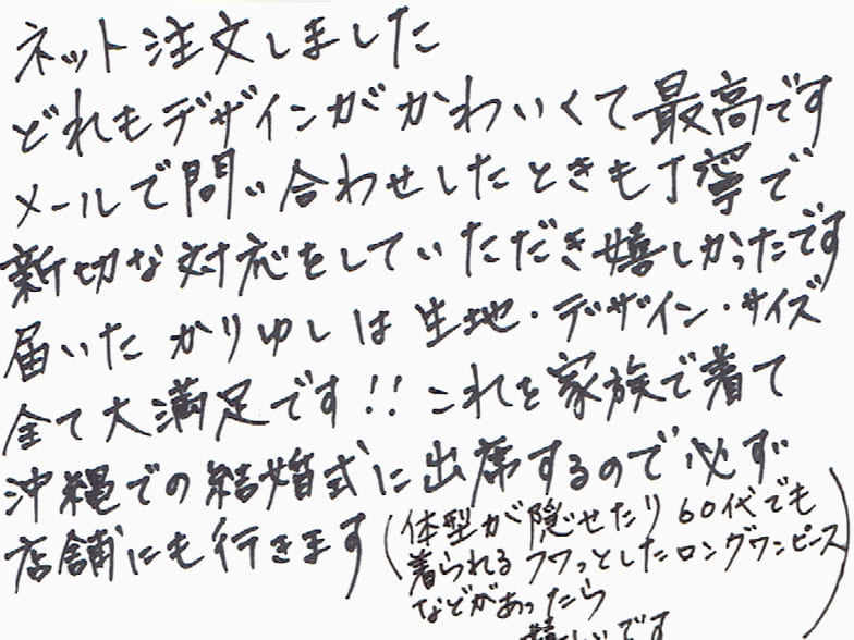 ネット注文しました。どれもデザインがかわいくて最高です。メールで問い合わせしたときも丁寧で親切な対応をしていただき嬉しかったです。届いたかりゆしは生地・デザイン・サイズ全て大満足です!!これを家族で着て沖縄の結婚式に出席するので必ず店舗にも行きます(体型が隠せたり60代でも着られるフワッとしたロングワンピースなどがあったら嬉しいです)