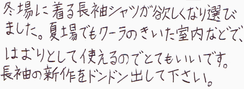 冬場に着る長袖シャツが欲しくなり選びました。夏場でもクーラのきいた室内などで、はおりとして使えるのでとてもいいです。長袖の新作をドンドン出してください。