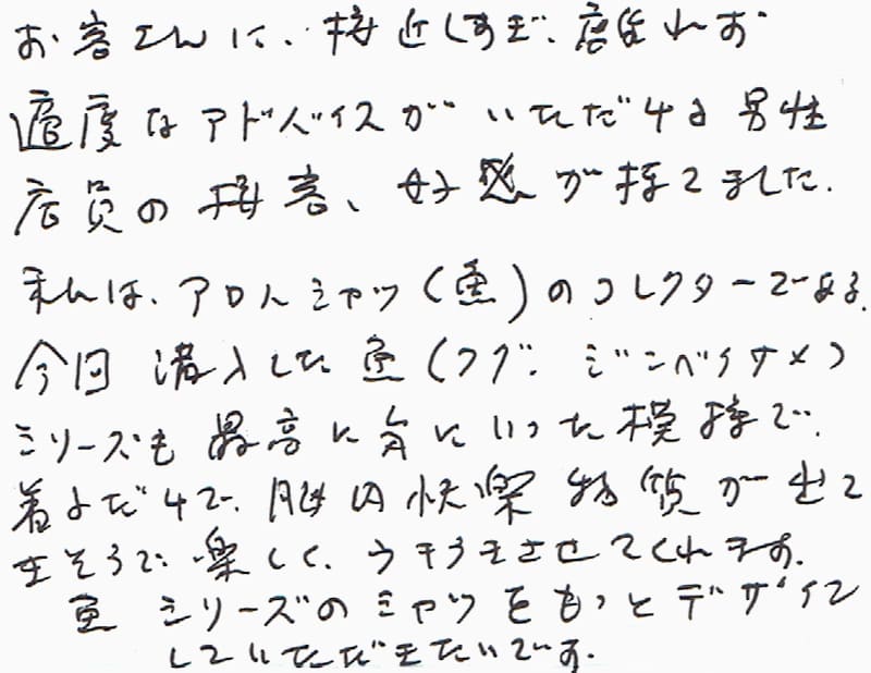お客さんに、接近しすぎ、離れず適度になアドバイスがいただける男性店員の接客業、好感が持てました。私はアロハシャツ(魚)のコレクターである。今回初めて購入した肴(フグ、ジンベイザメ)シリーズも最高に気に入った模様で着るだけで脳内快楽物質が出てきそうで楽しく、うきうきさせてくれます。魚シリーズのシャツをもっとデザインしていただきたいです。