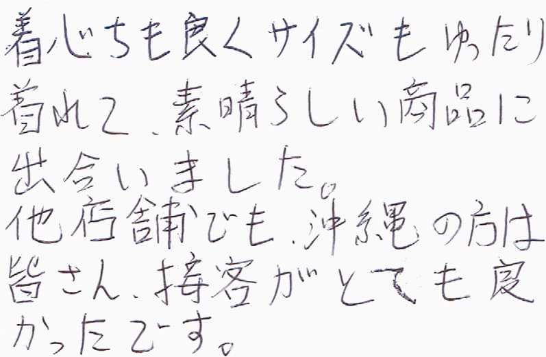 着心ちも良くサイズもゆったり着れて、素晴らしい商品に出合いました。他店舗でも、沖縄の方は皆さん、接客がとても良かったです。
