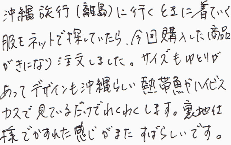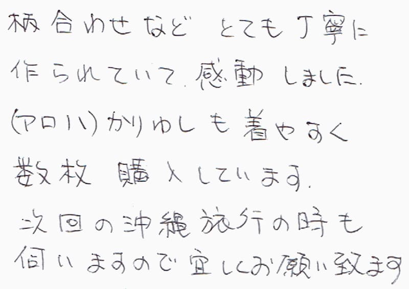 柄合わせなどとても丁寧に作られていて、感動しました。(アロハ)かりゆしも着やすく数枚購入しています。次回の沖縄旅行の時も伺いますので宜しくお願い致します