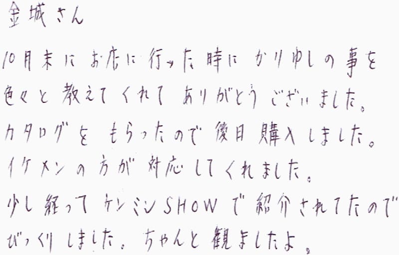 金城さん10月末にお店に行った時にかりゆしの事を色々と教えてくれてありがとうございました。カタログをもらったので後日購入しました。イケメンの方が対応してくれました。少し経ってケンミンSHOWで紹介されてたのでびっくりしました。ちゃんと観ましたよ。