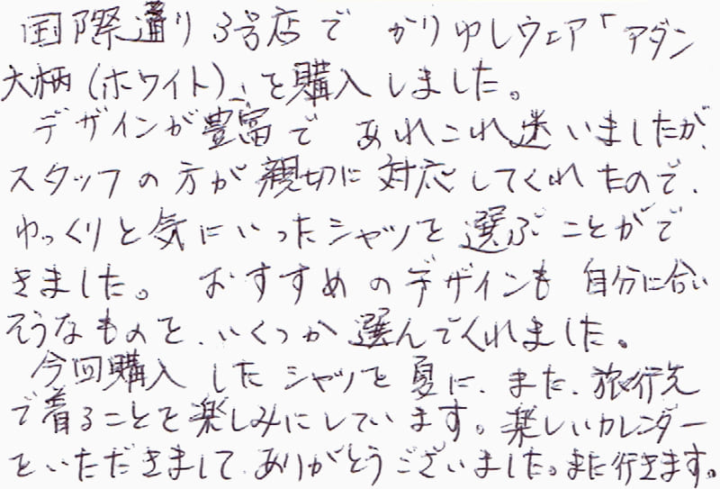 国際通り3号店でかりゆしウェア「アダン大柄(ホワイト)」を購入しました。デザインが豊富であれこれ迷いましたが、スタッフの方が親切に対応してくれたので、ゆっくりと気に入ったシャツを選ぶことができました。おすすめのデザインも自分に合いそうなものを、いくつか選んでくれました。今回購入したしたシャツを夏に、また、旅行先で着ることを楽しみにしています。楽しいカレンダーをいただきまして、ありがとうございました。また行きます。