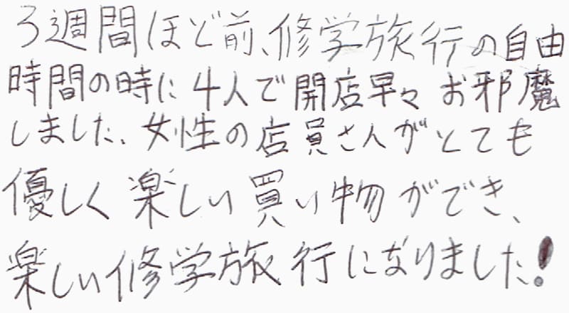 3週間ほど前、修学旅行の自由時間の時に4人で開店早々お邪魔しました。女性の店員さんがとても優しく買い物ができ、楽しい修学旅行になりました!