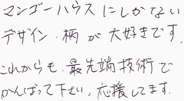 マンゴーハウスにしかないデザイン、柄がだいすきです。これからも最先端技術でがんばって下さい。応援してます。