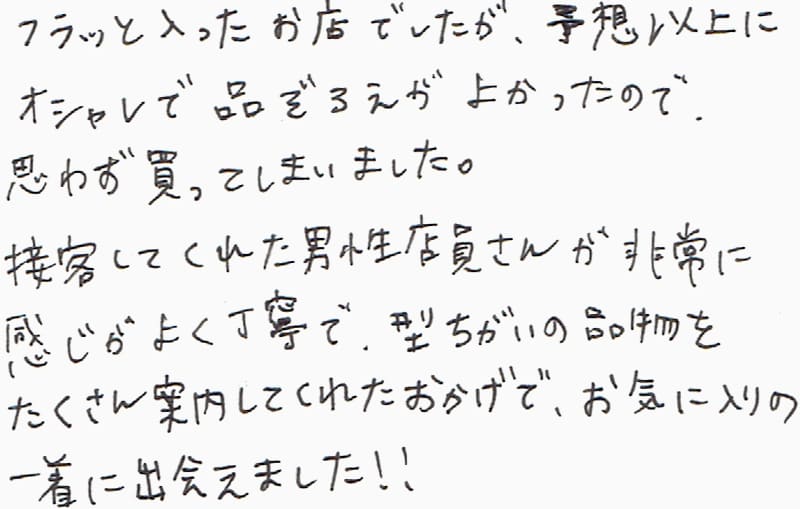 フラッと入ったお店でしたが、予想以上にオシャレで品ぞろえが良かったので、思わず買ってしまいました。接客してくれた男性店員さんが非常に感じが良く丁寧で、型ちがいの品物をたくさん案内してくれたおかげで、お気に入りの一着に出会えました!!
