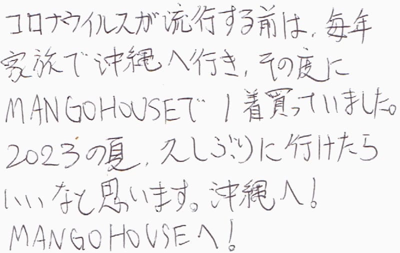コロナウイルスが流行する前は、毎年家族で沖縄へ行き、その度にMANGO HOUSEで1着買っていました。2023の夏、久しぶりに行けたらいいなと思います。沖縄へ!MANGO HOUSEへ!
