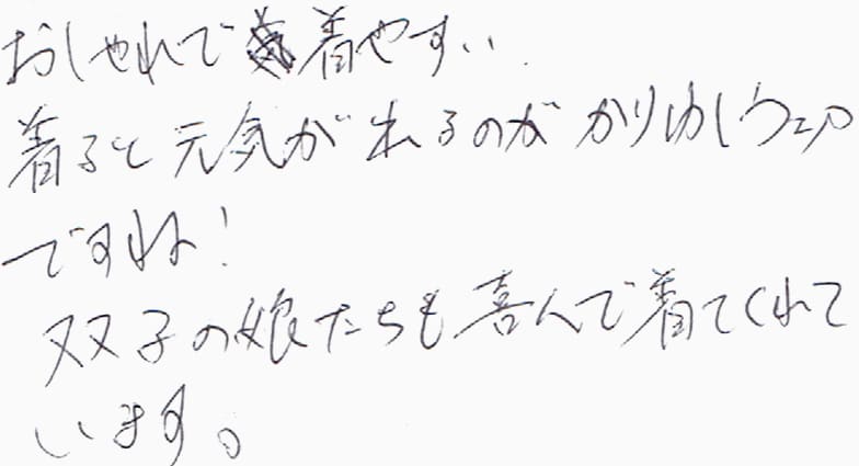 おしゃれで着やすい。着ると元気が出るのがかりゆしウェアですね!双子の娘たちも喜んで着てくれています。