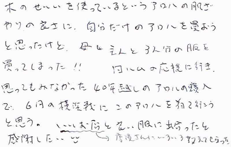 木のせんいを使っているというアロハの肌触りの良さに、自分だけのアロハを買おうと思ったけど、母と主人と3人分の服を買ってしまった!!日ハムの応援に行き、思ってもみなかった40年越しのアロハの購入で、6月の横浜戦にこのアロハを着て行こうと思う。いいお店(店員さんにいろいろ教えてもらった)と良い服に出会ったと感謝したい。