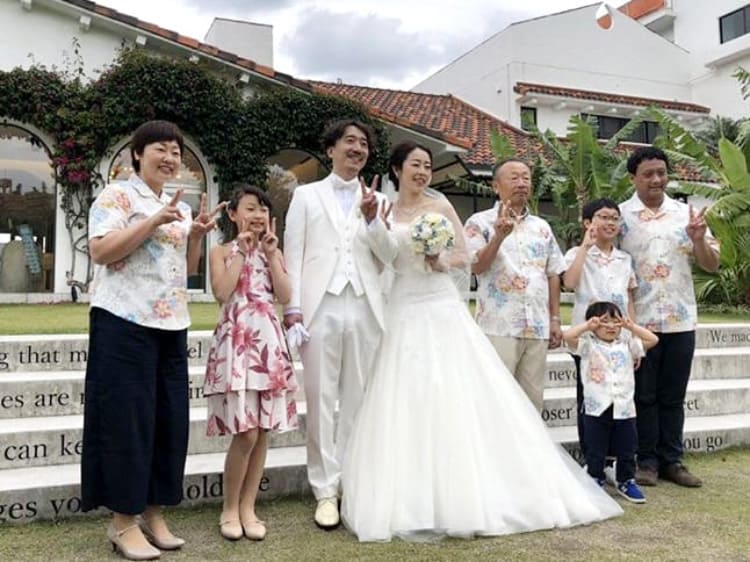 こじんまりと身内だけで、堅苦しくなく楽しい式に~がコンセプトでしたので、列席の私達もリゾート気分を味わおう!かりゆし着ちゃう!? というノリで家族でお揃いにしました。